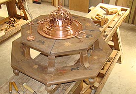 Braser de noguera de 200 anys antiguitat totalment restaurat amb incrustacions de boix, banús i coral. Amb els accessoris de llautó treballat.